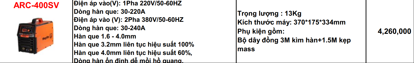 - Với các tính năng vượt trội như công nghệ IGBT hiện đại, khả năng hàn que lớn, tiết kiệm điện năng và phụ kiện đi kèm đầy đủ, máy hàn que MEGATEC ARC-400SV là sự lựa chọn lý tưởng cho các công trình xây dựng, nhà xưởng và các công việc hàn đòi hỏi độ bền cao.