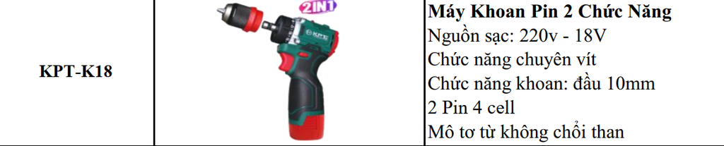 MÁY KHOAN PIN 2 CHỨC NĂNG KPTs KPT-K18 VỪA KHOAN LỖ VỪA BẮT VÍT TIỆN LỢI CHO MỌI NHÀ