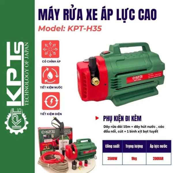 - Máy rửa xe áp lực cao KPT-H35 là dòng máy cao cấp thuộc nhãn hiệu KPTs Technology of Japan, được MINH THÀNH phân phối chính hãng.